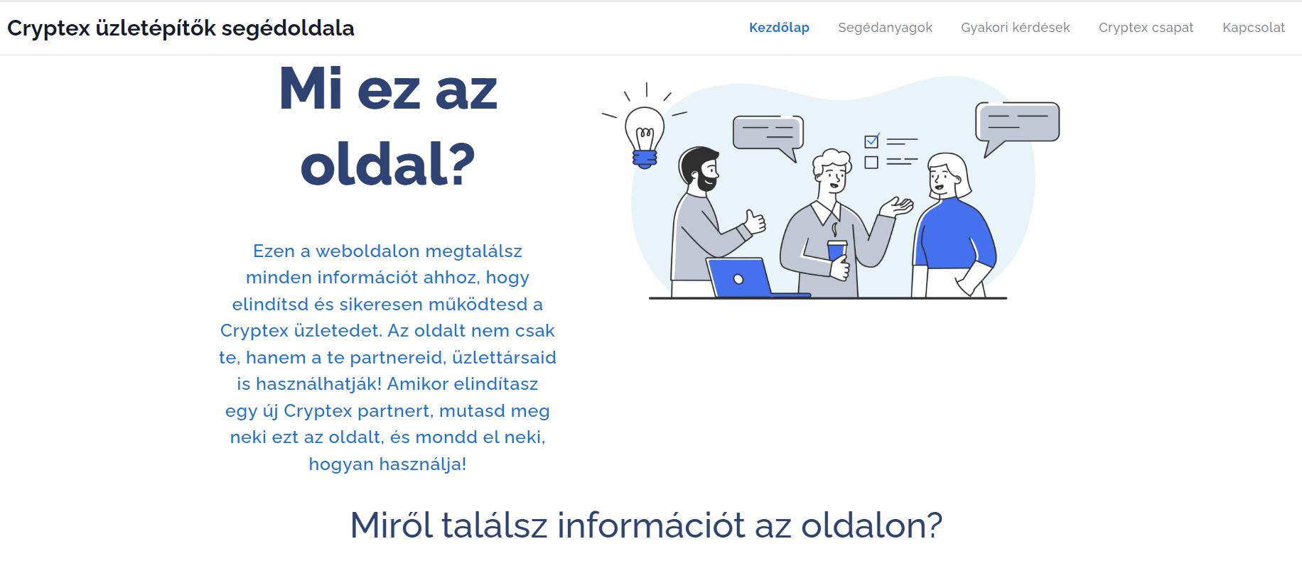 Minden partnernek, aki hozzám vagy az én közvetlen referráltjaimhoz csatlakozik, rendelkezésre áll egy segéd oldal, ahol minden kérdésre választ lehet találni, ami szükséges a Cryptex üzlet elindításához és működtetéséhez. Az oldal linkjét a regisztráció után elküldöm neked, a partnereidnek pedig te küldheted tovább.